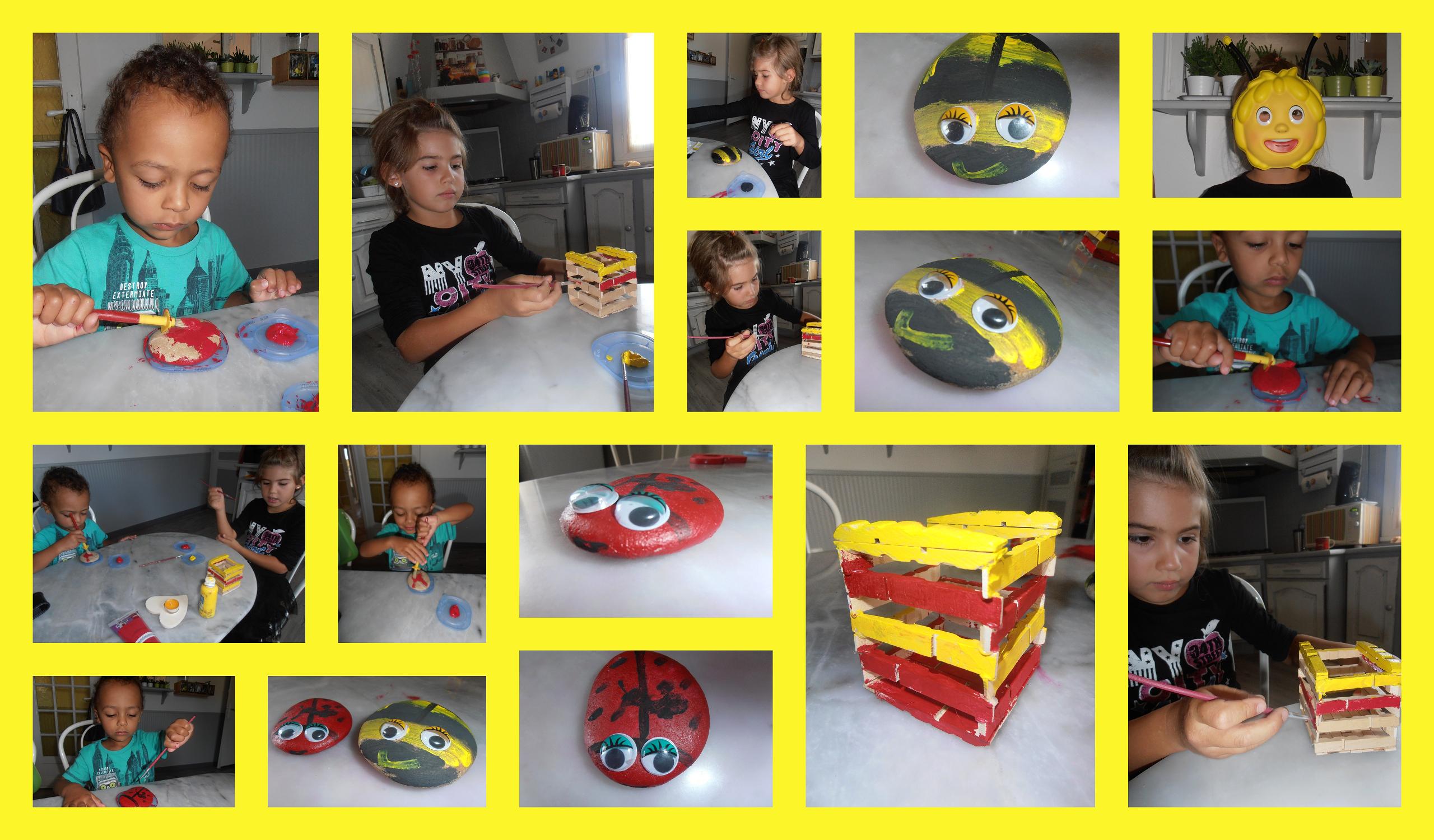 Plusieurs couches de rouge mise au rouleau par les enfants et tête noire faite par mes soins, collages des yeux et points noirs par les petits....